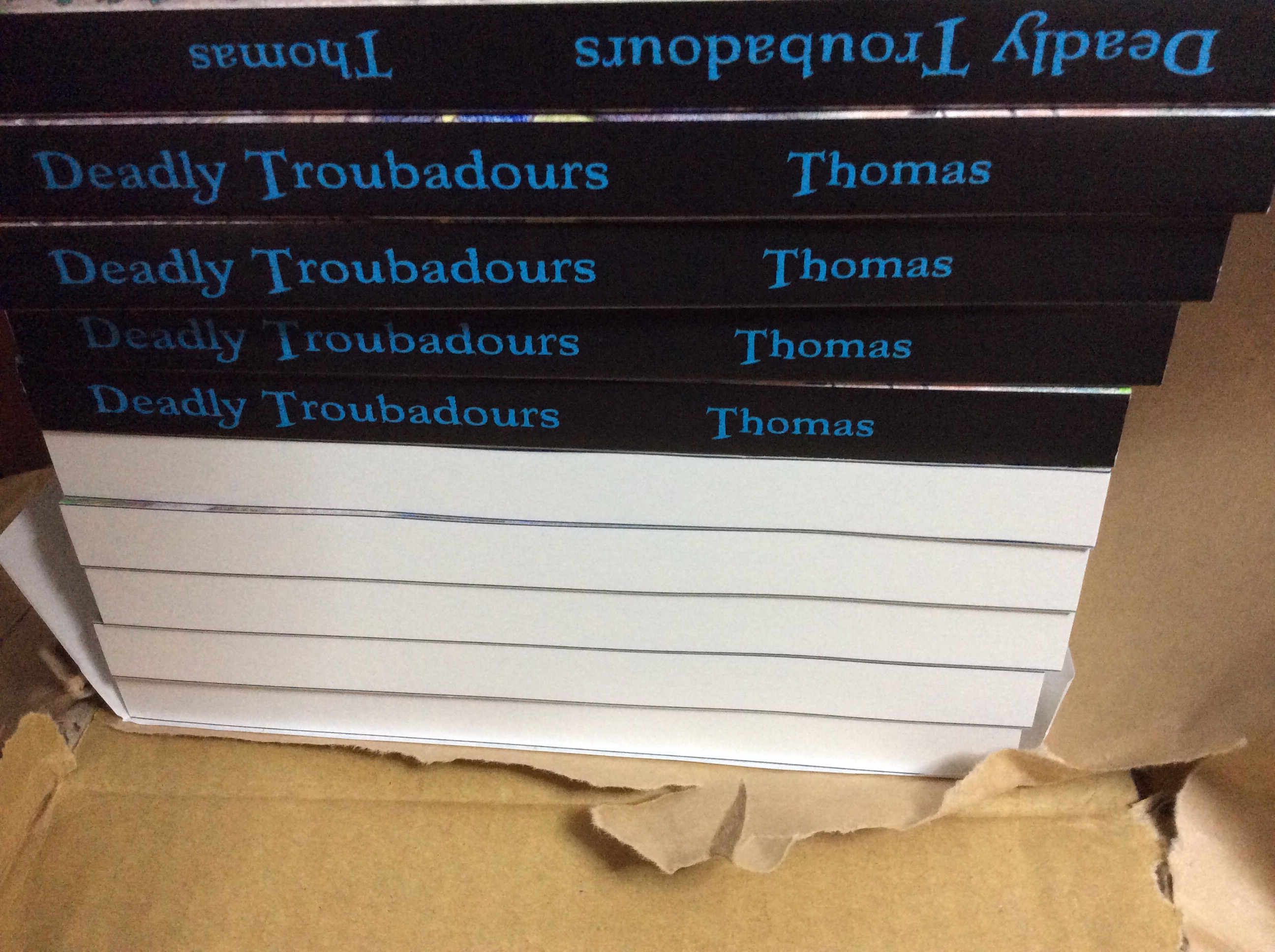 This morning at about 10:15 the doorbell rang. It was the delivery man with eight boxes containing a total of 300 books. Hot diggity. I opened up the top box. The books look great. They have a nice heft. Feel good in the hand. Easy to read. Nice. I couldn’t spend to much time with the because at 10:30 I had a Skype planning meeting for a future project. That meeting went nicely and when the project is a little farther along I will let some details slip.