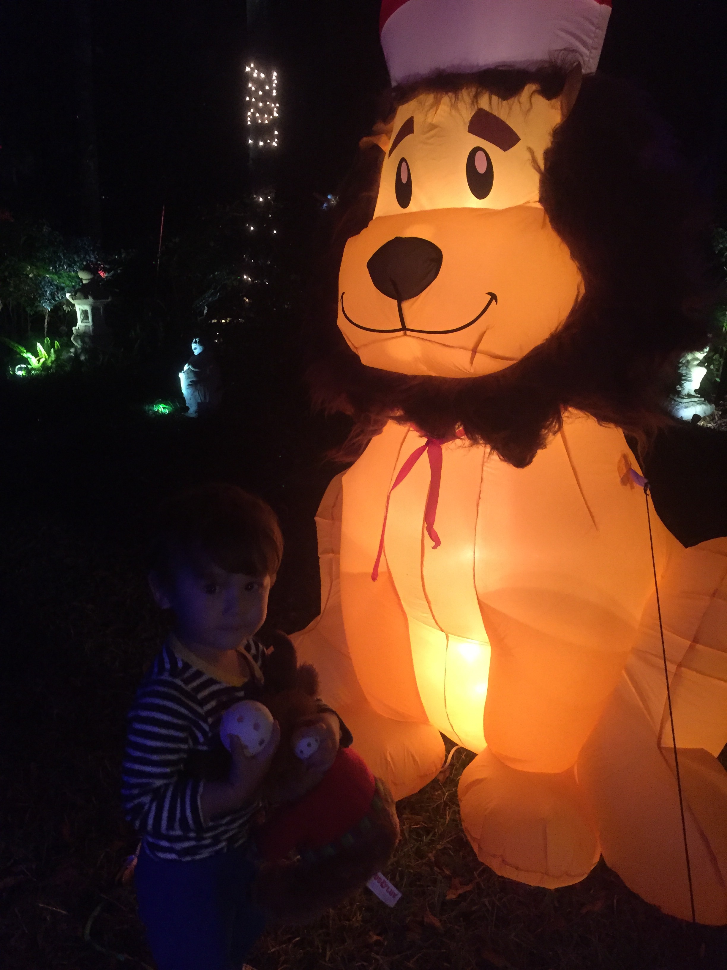 Instead I want to spend a few lines talking about the backyard my parents’ house. A crazy mix of little paths and statues. Of twists and turns and Christmas lights. There are link flamingoes across from stone monks. And currently there is also a six foot inflatable light-up lion.