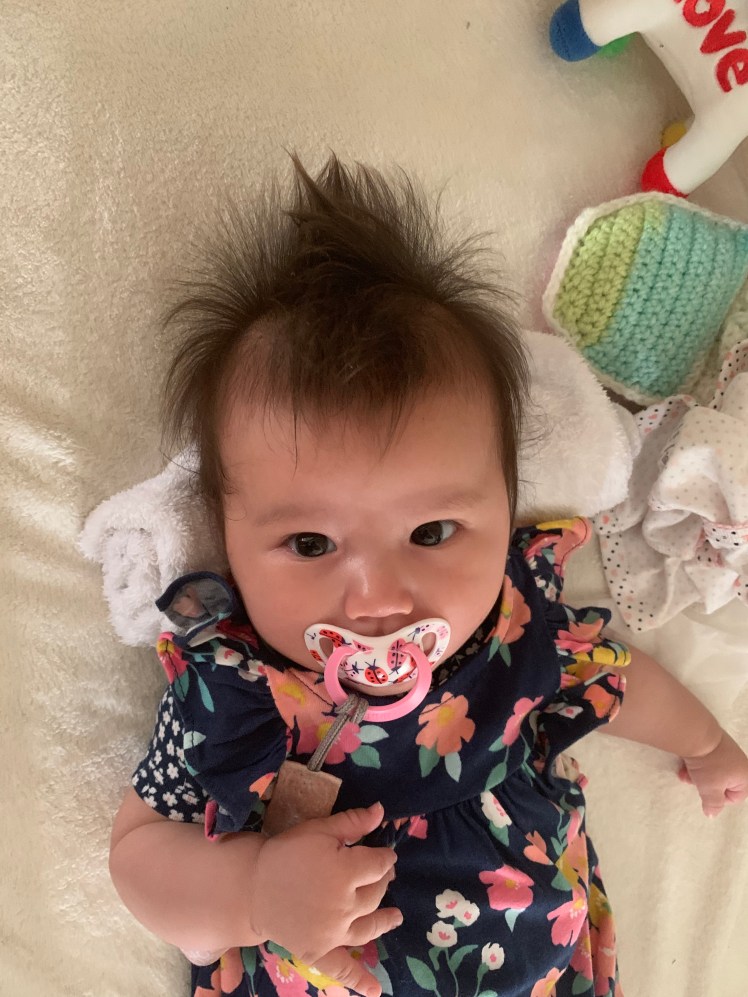 It’s current natural state of being is to stand straight up and kind of lean towards the middle, giving her a baby Mohawk. Combine that with her all seeing eyes. And she is just this intense little thing.