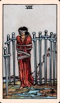 Looking at how the card is depicted in the popular illustrations by Pamela Colman Smith (under the instruction of A. E. Waite), we see a woman in woman in red standing above fetid, murky water. She is bound in rope and wearing a blindfold. Around her, eight long swords a re stabbed into the ground. At first. She seems helpless.