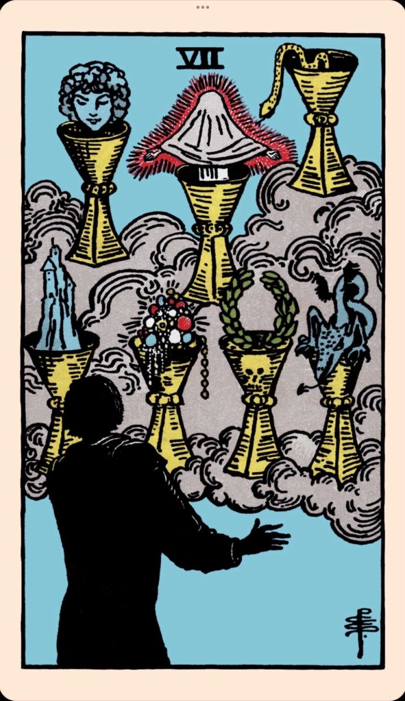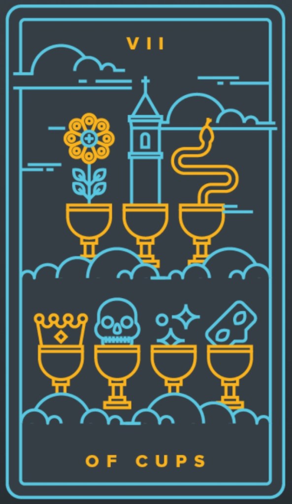 The Seven of Cups tells that the choices you have are plentiful, and likely overly so. The decision you need to make is being delayed by your failing to truly weigh your options. Are you truly examining those options? They may all come in gilded containers, but you might be at the point where you are failing to distinguish sapphires from serpents.